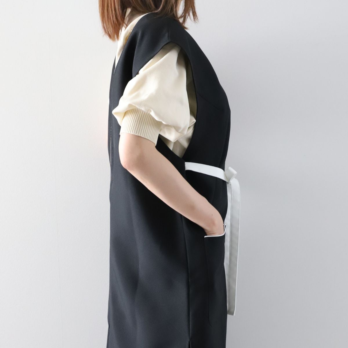 リボンで両肩の生地を固定したので