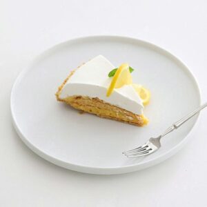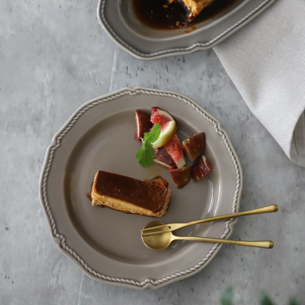 トーンで遊ぶカフェスタイルの彩り皿です。毎日のデザートにもおもてなしにも何とも言えない魅力のある1枚です。ケーキは縁から2〜3cm程度余白を取ることでスイーツに視線が集まり整った印象に。