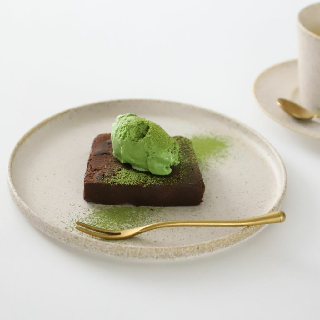 陶器の“ゆらぎ”が、スイーツをやわらかく包み込む。素朴さと上品さが同居する、心が落ち着く一皿です。