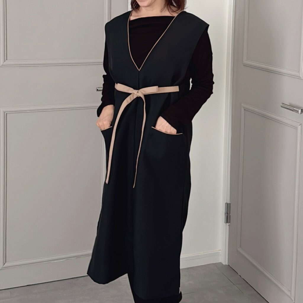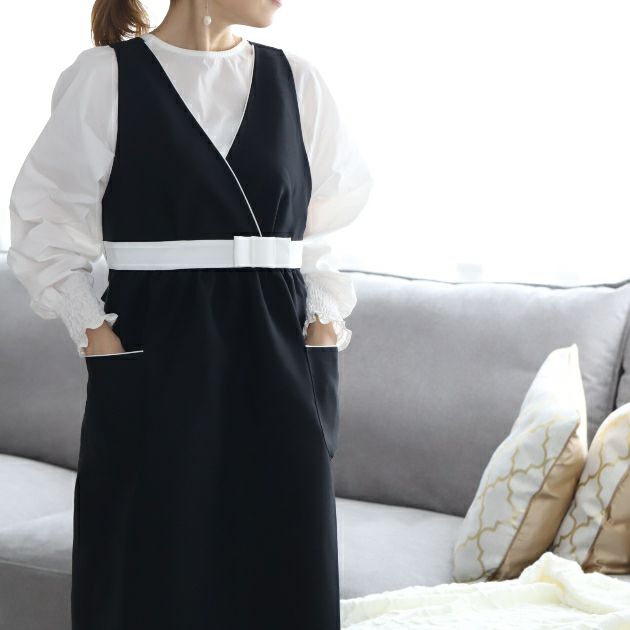 3.おしゃれエプロン カシュクールパイピングリボン ブラック