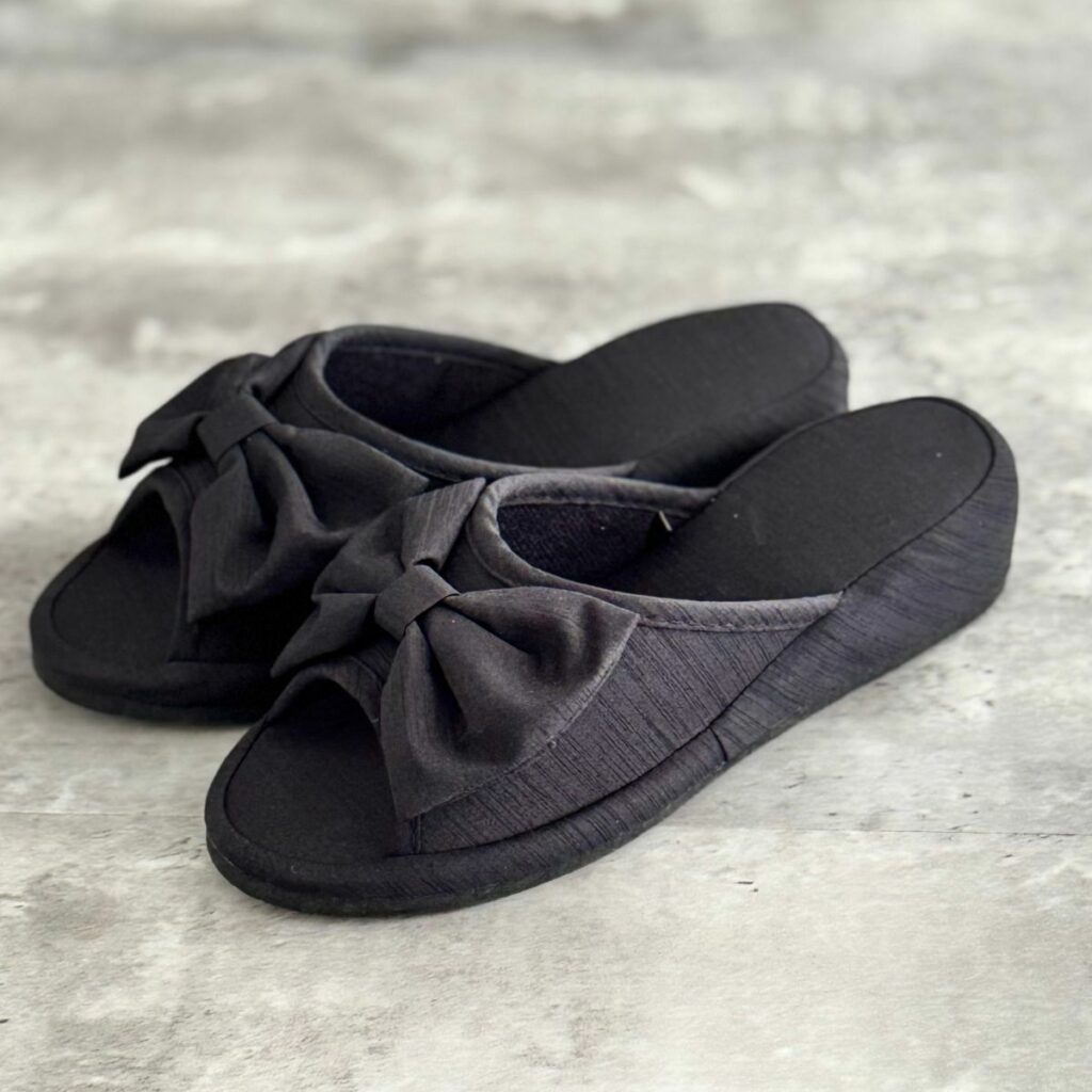 ヒールのあるエレガントな定番のリボンスリッパ。