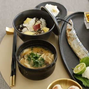 秋のさつまいもご飯には蓋付の陶製椀でおもてなし感をアップしてくれます。