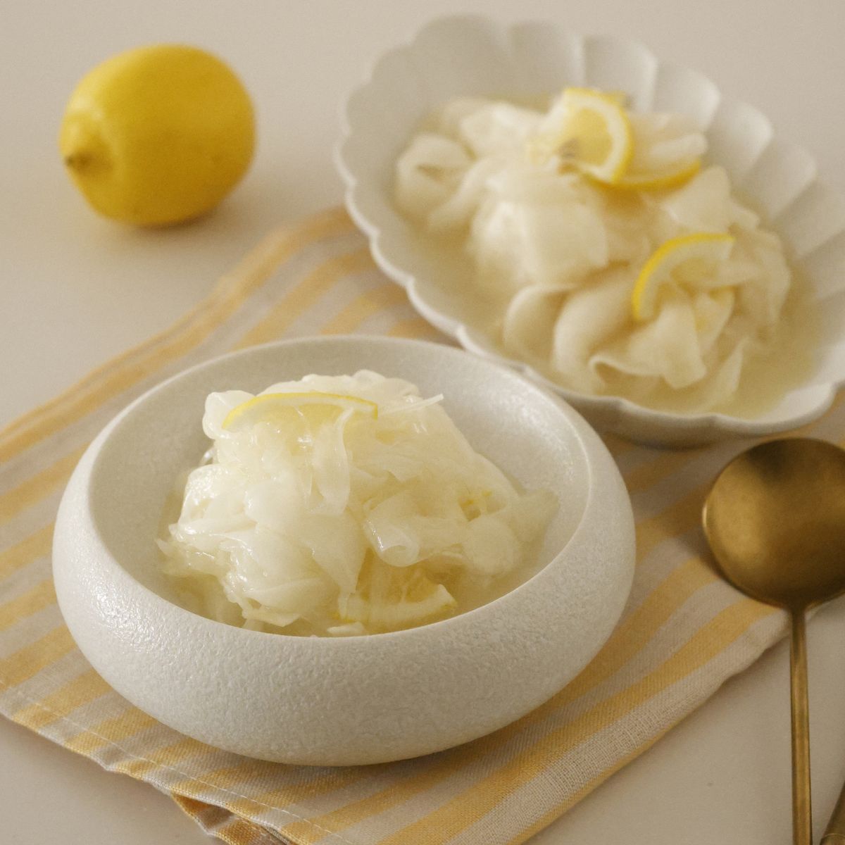 ボウルで(A)をよく混ぜ合わせ、玉ねぎと銀杏切りのレモンを加えて和える。