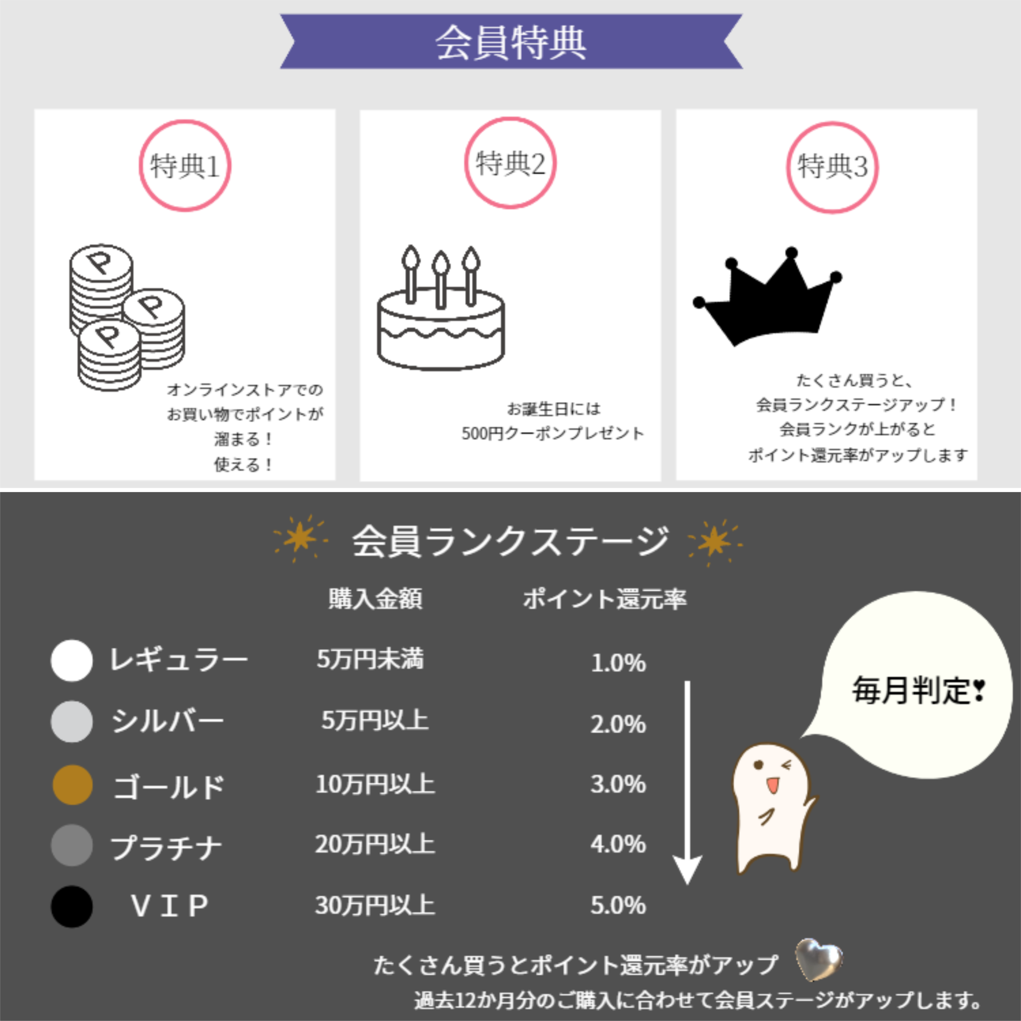 過去12ヵ月分のご購入にあわせて会員ステージがアップします。判定のタイミングは1ヶ月ごとに行われます。